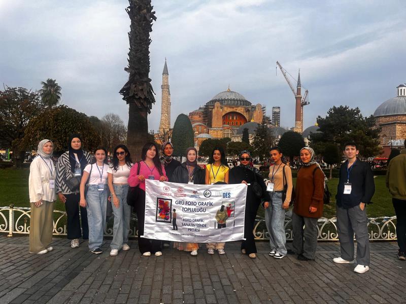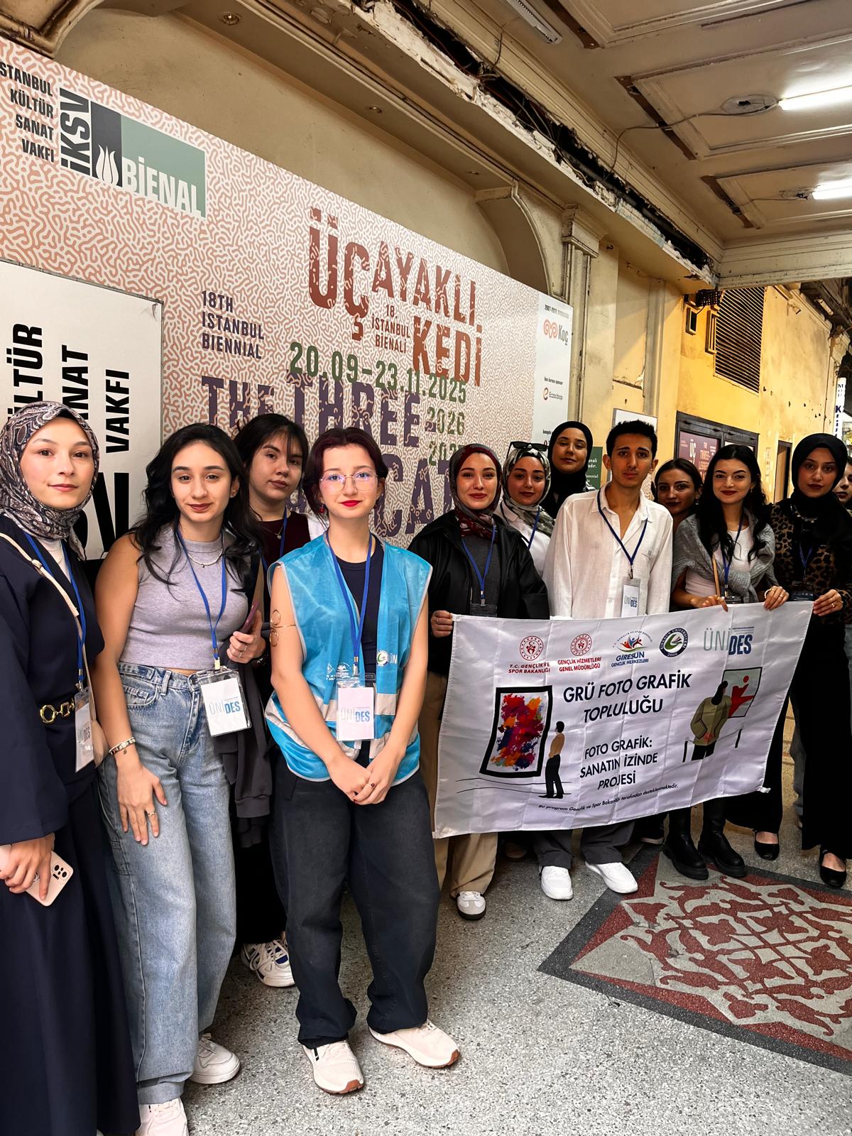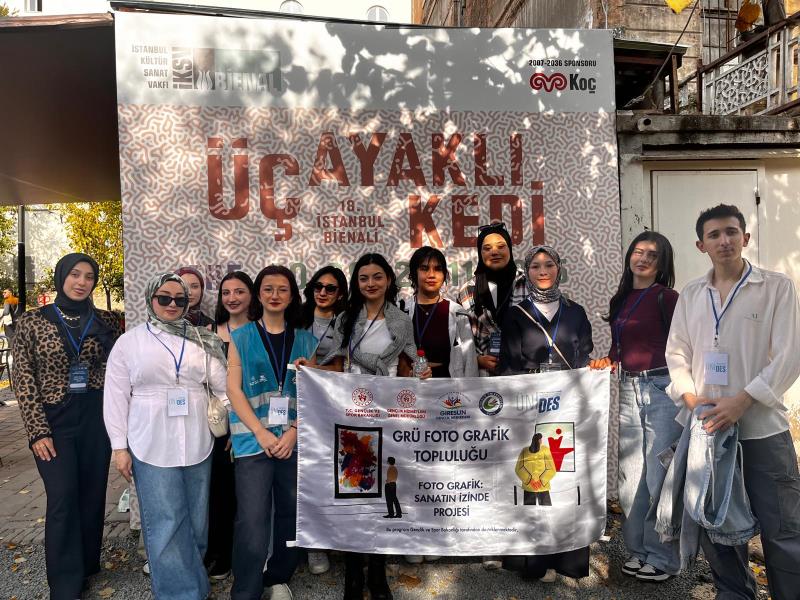Fakültemiz Grafik Tasarımı Bölümü öğrencileri, T.C. Gençlik ve Spor Bakanlığı tarafından yürütülen Üniversite Öğrenci Toplulukları İş Birliği ve Destek Programı (ÜNİDES) kapsamında desteklenen bir proje ile 21–23 Kasım tarihleri arasında 3 Ayaklı Kedi 18. İstanbul Bienali'ne katıldı. Öğrencilerimiz, topluluğun “Sanatın İzinde” projesi çerçevesinde katıldıkları bienalde güncel sanat pratiklerini yerinde inceleme fırsatı buldu. Bienalde sergilenen eserler ve gerçekleştirilen etkinlikler sayesinde sanatın farklı disiplinlerle kurduğu ilişkileri deneyimleyerek yaratıcı bakış açılarını genişlettiler. Projeye katılan öğrencilerimiz, hem ulusal hem de uluslararası sanatçıların çalışmalarını gözlemleyip sanatın güncel yönelimleri hakkında bilgi edindiler. Böylece sanatla iç içe bir ortamda, teorik bilgilerini pratik gözlemlerle pekiştirerek kendi tasarım süreçlerine yeni perspektifler kazandırdılar.